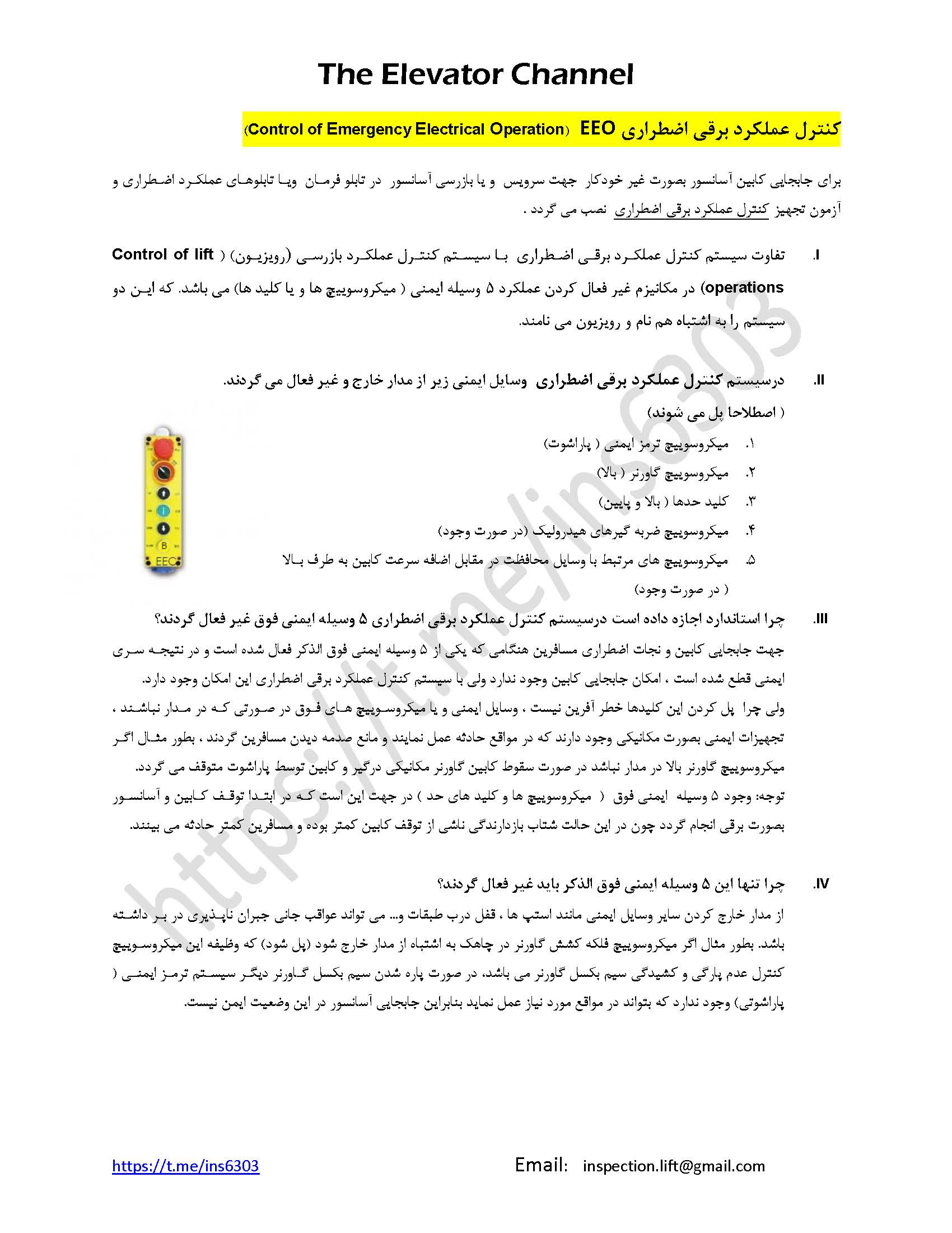 - تفاوت سیستم کنترل عملکرد برقی اضطراری با سیستم کنترل عملکرد بازرسی (رویزیون) (Control of lift operations) در مکانیزم غیر فعال کردن عملکرد ۵ وسیله ایمنی ( میکروسوییچ ها و یا کلید ها) می باشد. که این دو سیستم را به اشتباه هم نام و رویزیون می نامند.