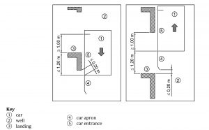 – فاصله عمودی بین درگاه طبقه و پایین ترین قسمت سینی زیر کابین از ۲۰۰ میلی متر بیشتر نباشد، و