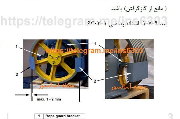برای فلکه کششی، فلکههای هرزگرد و چرخ زنجیرها جهت جلوگیری از بروز موارد زیر باید تمهیداتی مطابق جدول پیشبینی شود: الف- جراحت بدنی؛ ب – خارج شدن طنابها از درون شیارها ویا زنجیرها از چرخ زنجیرها در اثر شل شدن آنها؛ پ – ورود اشیاء بین طنابهای فولادی (یا زنجیرها) و شیارها (یا چرخ زنجیرها)…